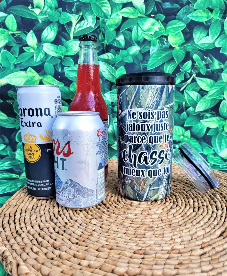 Ce contenant isotherme polyvalent maintient vos boissons à la température idéale, qu'il s'agisse de canettes standards de 355 ml, de canettes slim ou de bouteilles en vitre. Sa fonctionnalité double grâce à un second couvercle refermable le transforme en tasse isotherme, permettant de contenir jusqu’à 16 onces de liquide. Son design sublimé assure une finition durable et élégante, alliant praticité et style pour une expérience de consommation optimale.