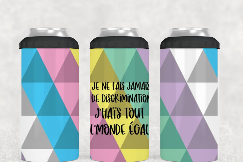 porte canettes 4/1 JE NE FAIS JAMAIS DE DISCRIMINATION , J'HAIS TOUT LE MONDE ÉGALE
